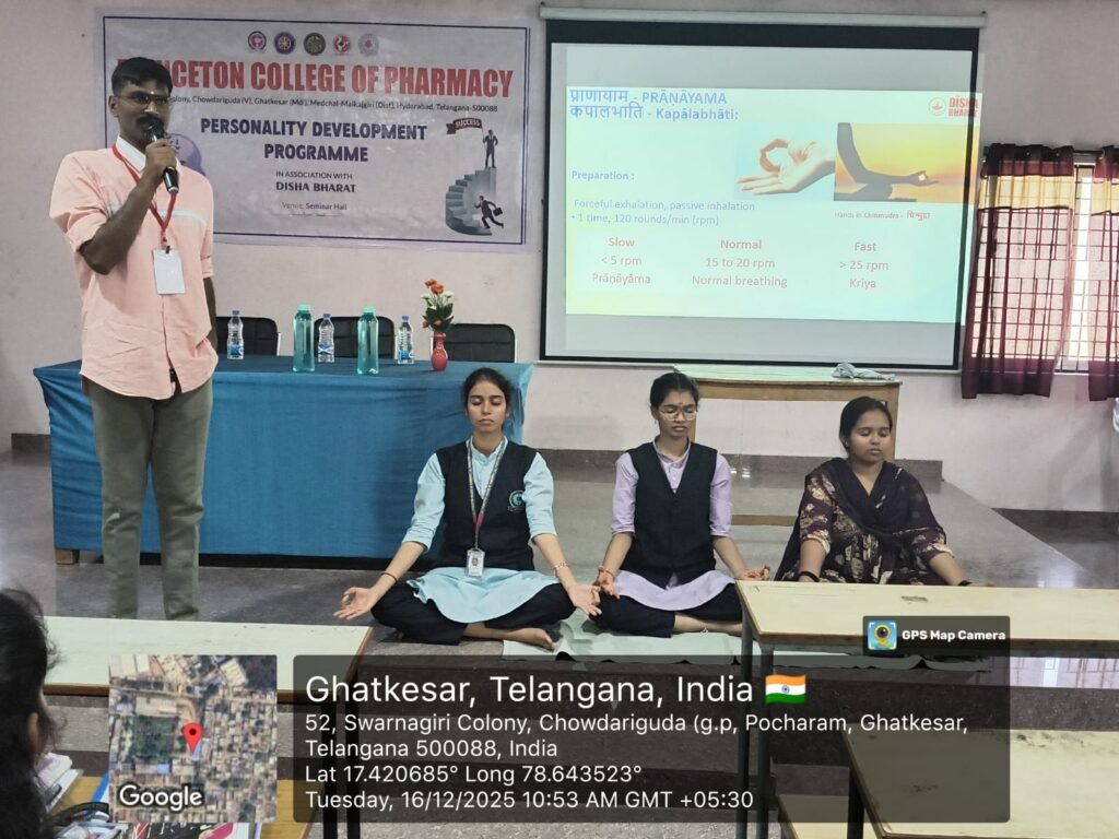 Princeton College of Pharmacy successfully organized a Personality Development Programme in association with DISHA Bharat on 16th December 2025 at the Seminar Hall, with the objective of fostering self-awareness, leadership qualities, ethical values, and holistic personality development among students. The programme was thoughtfully designed to inspire young minds to build strong character traits that are essential for both personal growth and professional excellence. The session was centered on the core philosophy of DISHA Bharat — “Know Yourself, Know Your Country, Know Your Culture.” Through engaging and thought-provoking deliberations, students were encouraged to introspect on their strengths, values, and responsibilities as individuals and as future professionals. The speakers emphasized the importance of confidence, discipline, integrity, and a positive mindset in achieving long-term success in life and career. Interactive discussions and motivational insights played a key role in keeping students actively involved throughout the programme. Participants were guided to set meaningful goals, develop leadership qualities, and cultivate ethical decision-making skills. Special emphasis was laid on the role of youth in nation building, highlighting how personal excellence and social responsibility together contribute to a stronger and more progressive society. The programme received an enthusiastic response from students and faculty alike. It proved to be highly impactful in shaping students’ attitudes, behavior, and outlook toward life and profession. Overall, the Personality Development Programme reinforced Princeton College of Pharmacy’s commitment to value-based education, helping transform students into confident, disciplined, and socially responsible professionals prepared to face future challenges with clarity and purpose.