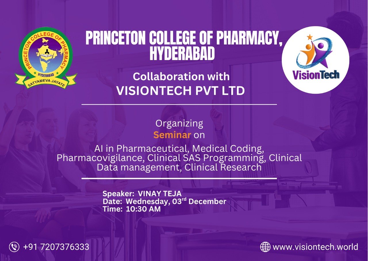 Princeton College of Pharmacy, in association with Vision Tech Pvt. Ltd., Hyderabad, organized a comprehensive career-oriented seminar on 3rd December 2025, focusing on emerging and high-demand domains in the pharmaceutical and healthcare sectors. The seminar covered a wide range of advanced topics, including Artificial Intelligence in Pharmaceuticals, Medical Coding, Pharmacovigilance, Clinical SAS Programming, Clinical Data Management, and Clinical Research, offering students valuable exposure to contemporary industry practices.