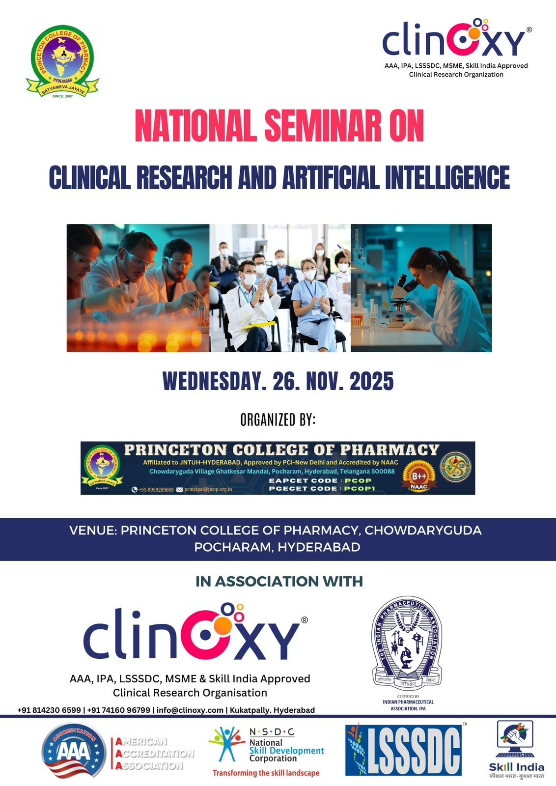 Princeton College of Pharmacy, in association with ClinOxy Clinical Research Organization, organized a National Seminar on “Clinical Research and Artificial Intelligence” on Wednesday, 26th November 2025, at the Princeton College of Pharmacy campus, Chowdaryguda, Ghatkesar, Hyderabad. The seminar was conducted with the objective of providing in-depth insights into the rapidly evolving integration of artificial intelligence (AI) within the field of clinical research and its growing impact on modern healthcare systems.